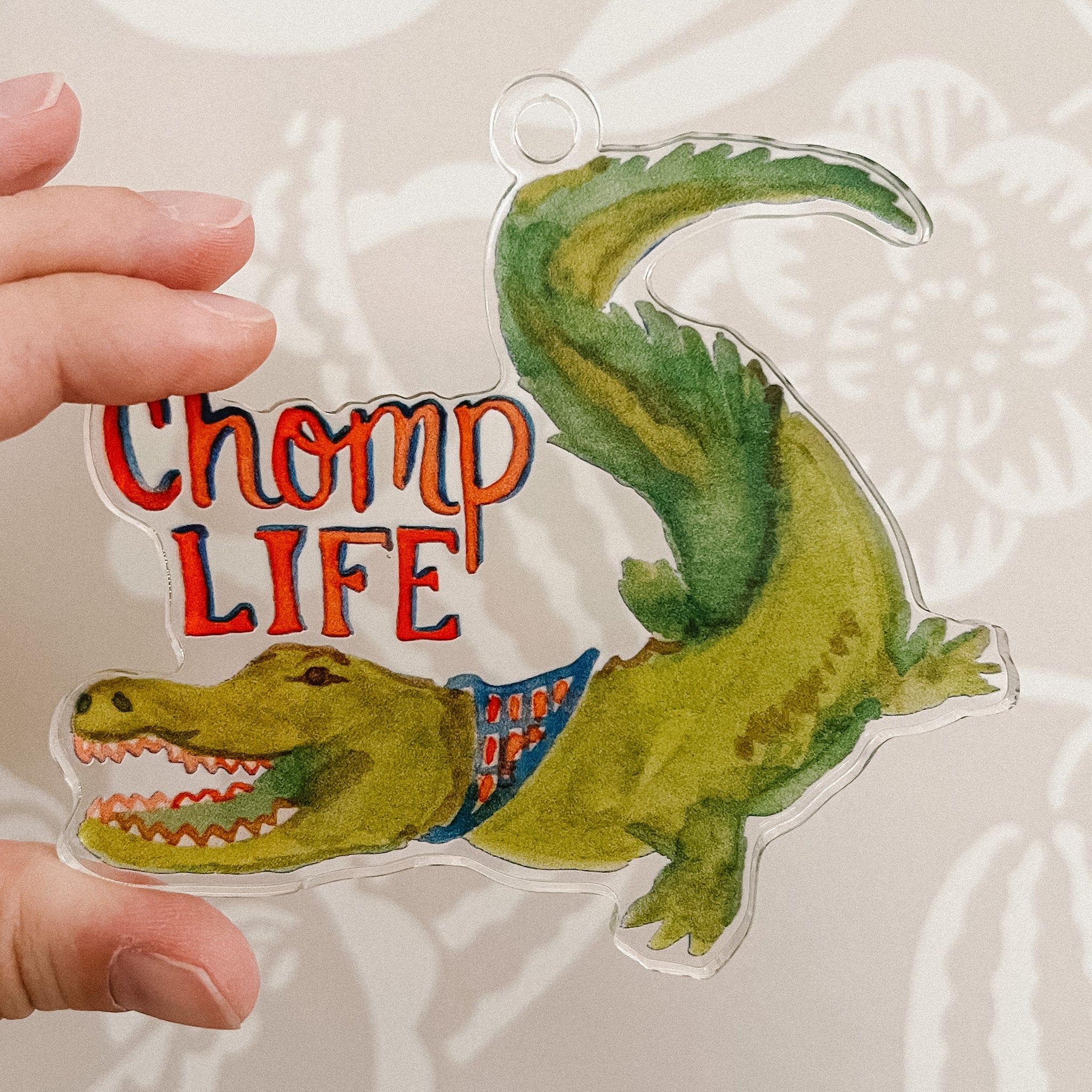 Add a playful bite of fun to holiday décor with the Chomp Life Ornament. For college football fans, Florida fans, or game day lovers in the south. Featuring a watercolor illustration of a swamp loving, cheerful alligator and the phrase “Chomp Life,” this ornament blends whimsical charm with vibrant artistry. Printed on durable acrylic with a glossy finish, it’s lightweight, sturdy, and perfect for gifting or collecting.