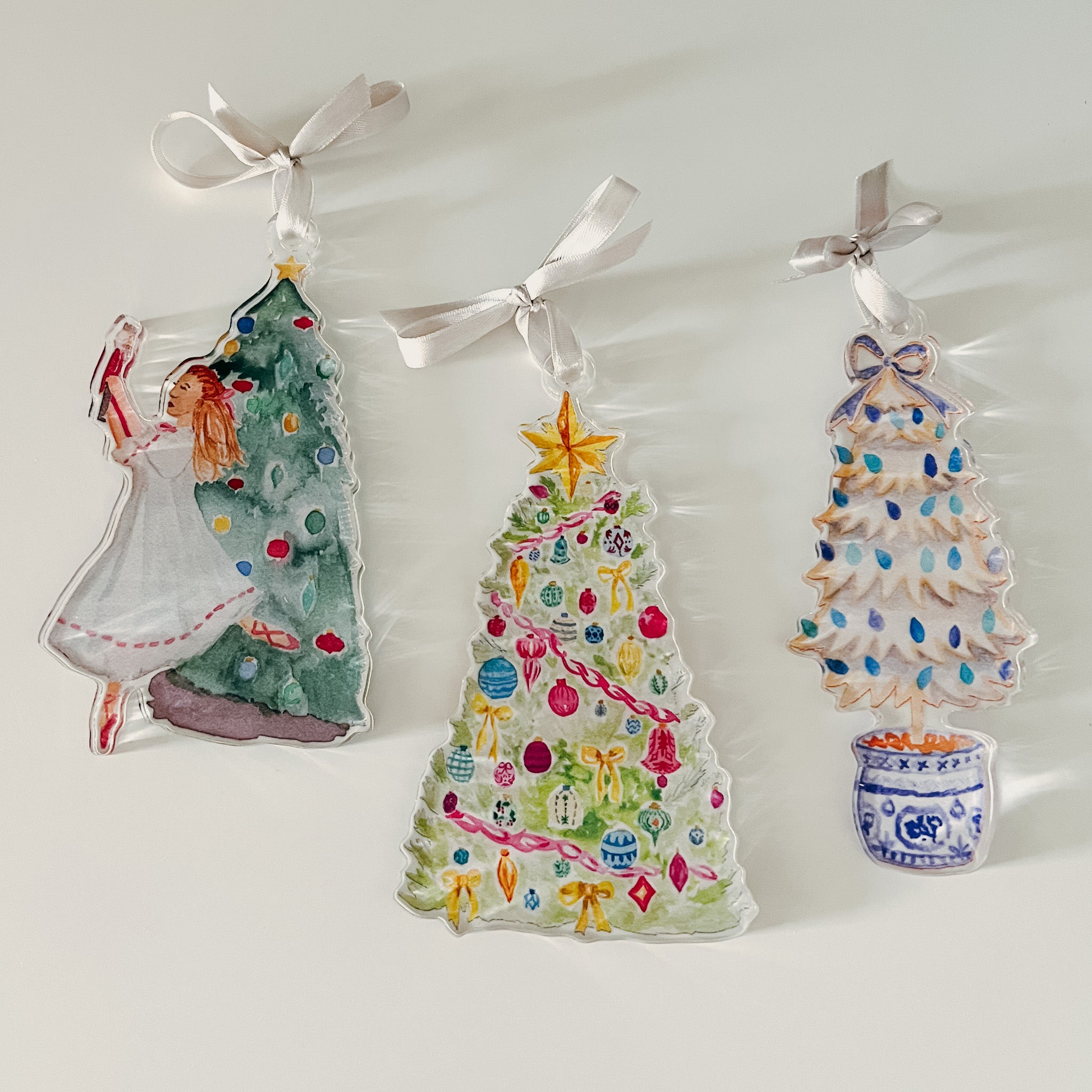 Celebrate the magic of the season with the Clara with Nutcracker Ornament, featuring a delicate watercolor illustration of Clara holding her Nutcracker beside a beautifully decorated Christmas tree. Printed on durable acrylic with a glossy finish, this ornament captures the timeless charm of the holiday classic The Nutcracker and makes a thoughtful keepsake for collectors, dancers, and holiday lovers alike.
