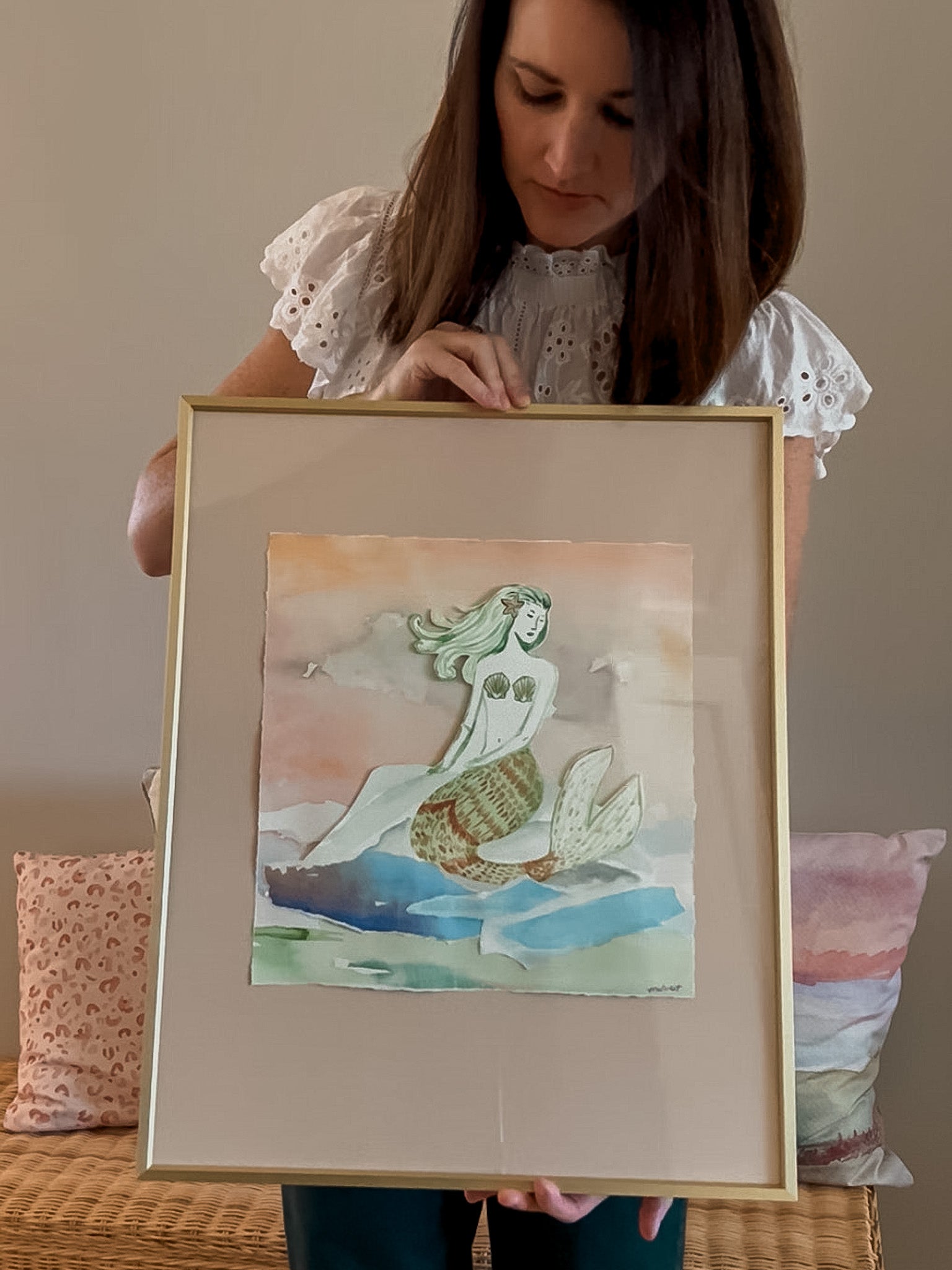 The largest framed piece in the series, Sirena perches on a rock above the sea, rendered with layered torn paper to create depth and movement. The background palette draws inspiration from the abstract work Marsh #1, later translated into a pillow design, while soft corals and greens echo throughout—pulled directly from Sirena’s own color story.